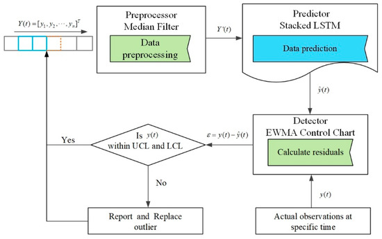In the framework of proposed MF-stacked LSTM-EWMA approach, the MF algorithm takes the raw data as input to preprocess obvious anomalies in the first step. The stacked LSTM approach is used to establish a predictor in the second step. The last step identifies anomalies via the EWMA control chart.