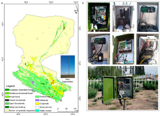 Research area and various types of dataloggers for environmental monitoring. (a) The location of the research area and Arou superstation. The red plots represent the locations of the 11 observation stations; (b) The various types of dataloggers deployed in the Heihe River basin for environmental monitoring, which consist of 4G wireless modules and sensors.