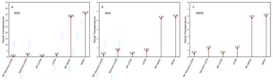 The resulting mean squared error (MSE), mean absolute error (MAE), and root-mean-square error (RMSE) with different approaches for the panel temperature. (a) The results for the MSE; (b) The results for the MAE; (c) The results for the RMSE.