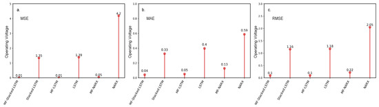 The resulting MSE, MAE, and RMSE with different approaches for the operating voltage. (a) The results for the MSE; (b) The results for the MAE; (c) The results for the RMSE.