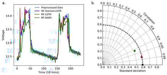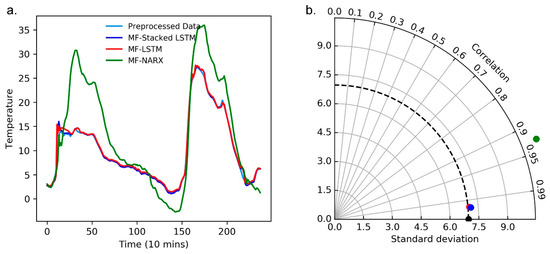 Moreover, we use a curve diagram and a Taylor diagram to show the performance of MF-stacked LSTM, MF-LSTM and NARX. In Figure 7a and Figure 8a, the horizontal axes represent the number of predicted and raw values, where the raw value was collected every ten minutes, the curve diagrams show that compared to MF-LSTM and MF-NARX, the results of MF-stacked LSTM are closest to the raw data.