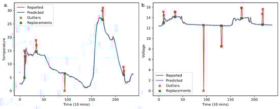 Figure 9 shows the found anomalies, along with their raw and replaced values for the panel temperature and operating voltage. Similar to Figure 7 and Figure 8, the horizontal axes represent the number of predicted and raw values in Figure 9. The anomaly detection results for the panel temperature are shown in Figure 9a. The anomalies are replaced by the predicted values, and the stacked LSTM predictor appears to be particularly accurate. Additionally, we evaluate the detection performance for the operating voltage using the stacked LSTM predictor. The performance of the anomaly detector can be seen clearly in Figure 9b. It is important to note that the stacked LSTM predictor-based anomaly detector is robust due to the advantages of stacked LSTM.
