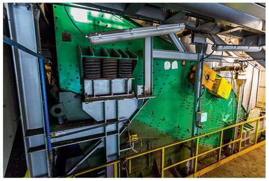 In the considered machine (see Figure 1 and Figure 2), a sieving screen is designed to separate the input raw material into three classes: less than 40, 40–110, and more than 110 mm. The material stream is coming into the screen (falling on the deck) from a conveyor located on the top. The screen supports consist of four sections with three springs in each corner. The screen is driven by two electric motors and individual belt transmissions. Special spherical roller bearings are used on the shafts of unbalanced exciters, see [] for more details.