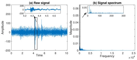The trajectory of a raw signal—panel (a), and the signal spectrum—panel (b) for the real data analyzed in Section 5.