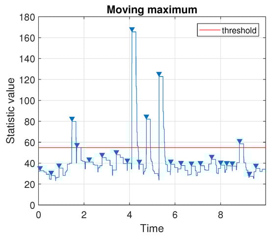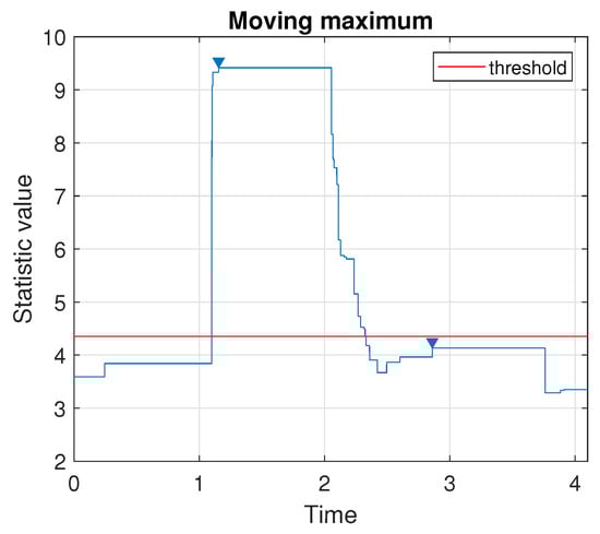 To find the location of the generated impulse, first, we apply the method determining the number of impulses in the signal. According to the procedure presented in Section 3.2, we plot the values taken by the moving maximum, see Figure 6. Since there is one local peak located above a chosen threshold (a quantile of order ), we conclude that there is only one impulse in the signal.