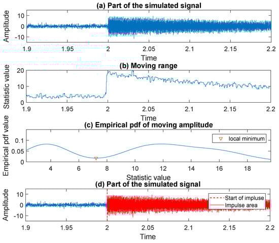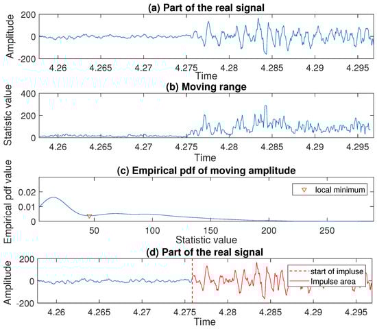 Let us consider the third impulse detected in the signal on the previous stage of the analysis, namely, the one with the peak located between and . To find its start we follow the procedure presented in Section 3.3. The consecutive steps are shown in Figure 16, where we present a part of the real signal—panel (a), the values taken by the moving range statistic—panel (b), and the corresponding empirical probability density function—panel (c). Finally, on panel (d) one can see the moment when the impulse starts marked with a red dashed line. As mentioned above, the same procedure is used to detect the beginning of all five remaining impulses present in the signal.