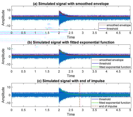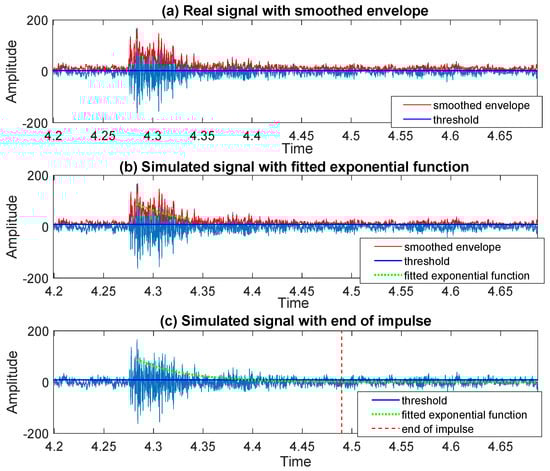 where is the Hilbert transform of the original data, see []. Then, the envelope of the signal is given as the absolute value of the analytic signal given in Equation (6), namely . In the next step, we smooth the envelope of the signal using the simple two-sided moving average method, see [], and we fit an exponential function to the smoothed envelope of the impulse staring from the peak found at the previous stage of the analysis, see Section 3.2. As the end of the approximation interval, we choose the point where the envelope intersects the threshold determined based on the standard variation of the signal. In addition, consequently, as the end of the impulse, we consider the point where the fitted exponential function is flattered. In practice, we identify the moment when the difference in values taken by the fitted function for adjacent samples takes a value less than the selected . For real signal, the value of is chosen to be equal to .