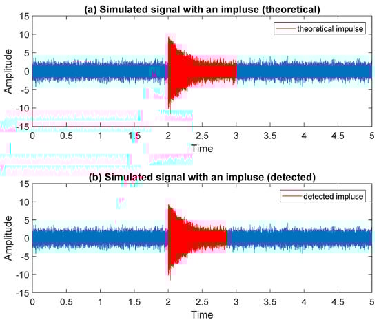 Simulated signal with an impulse marked in red: theoretical—panel (a), and detected using the proposed methodology—panel (b).