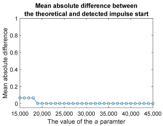 Mean absolute difference between the theoretical and detected impulse start calculated based on simulated signals with exponentially decaying impulse as in Equation (7) where , and a is changing from 15,000 to 45,000.