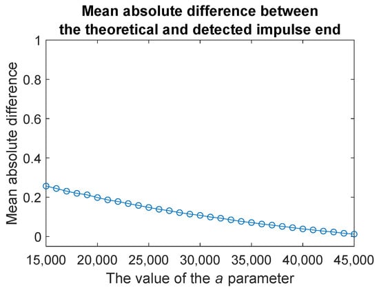 Mean absolute difference between the theoretical and detected impulse end calculated based on simulated signals with exponentially decaying impulse as in Equation (7) where , and a is changing from 15,000 to 45,000.
