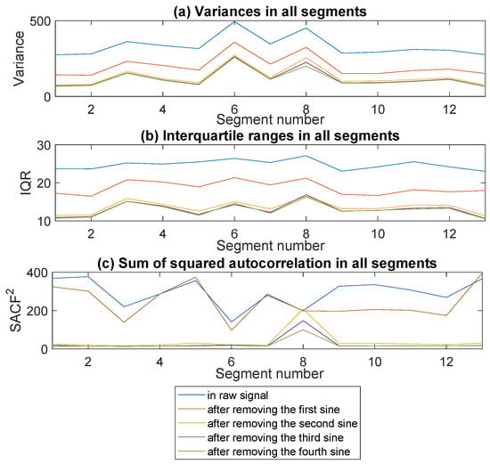 Sample variance, interquartile range and sum of squared auto-correlation calculated for the subsequent segments for the raw signal and the signals obtained after removing the sine functions.
