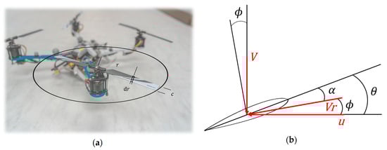 (a) Rotation disk of a variable-pitch propeller (VPP) system; (b) diagram to explain the blade element momentum (BEM) theory.