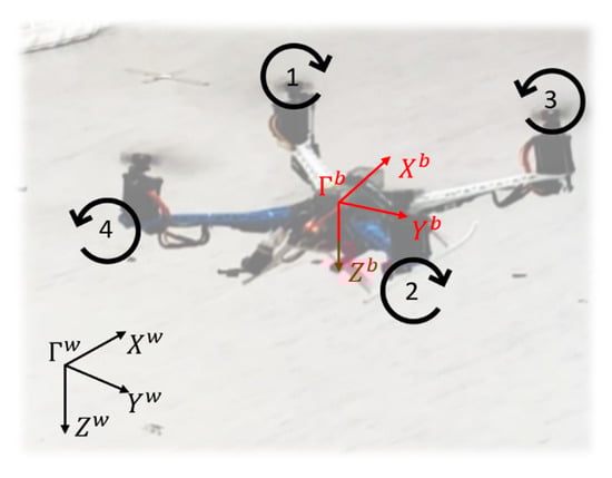 The coordinate system used for our modeling is shown in Figure 2. The world coordinate system () is defined with the fixed North–East–Down (NED) frame, and the vehicle’s body coordinate system () is located at the center of mass of the UAV system with the axis pointing forward and the axis pointing downs. Propellers 1 and 2 rotate clockwise, while propellers 3 and 4 rotate counterclockwise.