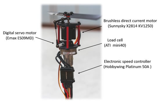 A static thrust experiment of the VPP system is introduced in this section. The setup of the experimental hardware is shown in Figure 3. The whole system was mounted directly on an ATI Mini40 F/T sensor (ATI Industrial Automation, Apex, NC, USA), which was fixed on a metal tube assembled on the workbench. The whole system contained two separate actuators. The first one was a digital servo Emax ES09MD (EMAX model, Shenzhen, China) to control the pitch angle and the second was a motor and its electronic speed controller (ESC). The motor was the Sunnysky X2814 KV1250 (Sunnysky, Zhuhai, China), and the ESC was a Platinum 50A V3 from Hobbywing (Hobbywing, Shenzhen, China). The rotation speed and the pitch angle were controlled by the Arduino Mega, which was programmed with a built-in closed-loop governor.