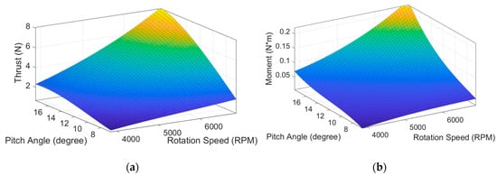 Figure 4 shows the results of the static thrust experiment. The response surfaces of the thrust, moment of force, energy consumption, and efficiency to the pitch angle and rotational speed of the propeller are plotted. The thrust per unit watt is defined as the thrust divided by the power used by the motor (). According to the experiment results, the pitch angle of the maximum energy efficiency at zero airspeed was approximately , which was set to be the of the proposed system to minimize the power consumption under hover conditions.