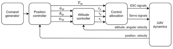 The simulation environment was built up within the MATLAB Simulink environment. The built-in Aerospace Blockset was used to represent the equations of motion of the UAV system. Figure 5 represents the workflow of the simulation. The flight control strategy of this study was adopted from the PX4 flight stack, which is a series of cascade proportional–integral–derivative controller (PID) control structures. The control system contained three sections: Position controller, attitude controller, and control allocation system.