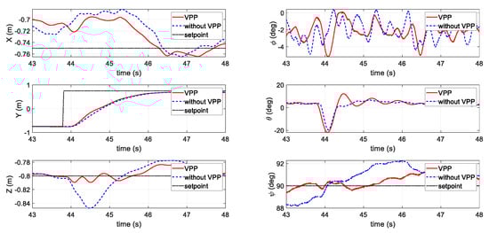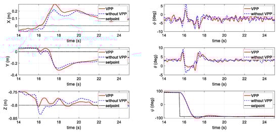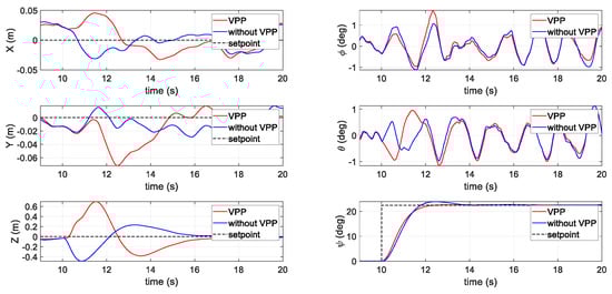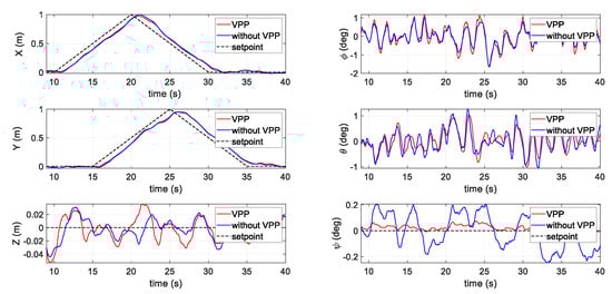 The last simulation scenario is displayed in Figure 9, which demonstrates a simple waypoint mission in the horizontal direction. The speed was set at ±0.1 m/s at each axis. In the left column, which shows the positions of the simulation, the following of the X, Y, and Z axes performed evenly during the gentle position commands. However, the main difference is the improvement in the yaw () direction. As shown on the bottom right-hand side of Figure 9, during the position movement, the yaw response with VPP activated was more stable compared to that without a VPP controller.