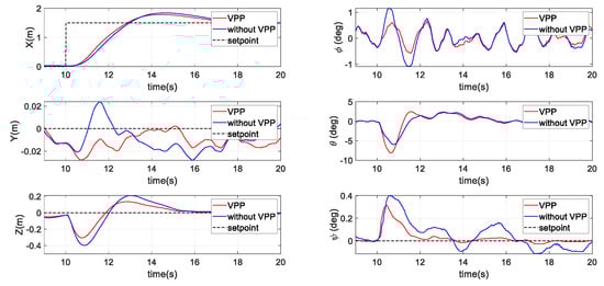 Figure 8 presents the simulation results of the tracking performance of the systems with and without VPP under a step position command. The command and response position of the X axis are shown in the top left, in which a 1.5 m step position command was generated at t = 10 s. Similar to the results of the previous position holding simulation, the VPP system showed its strength in reducing the response time by approximately 100 ms and had a slightly smaller overshoot (5%) to that of the fixed-pitch system. In addition, while generating larger force to achieve a faster maneuver, the interferences against the altitude and heading (yaw) generally remained smaller for the VPP system.