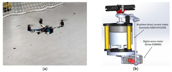 As shown in Figure 10a, a typical X-type quadrotor structure was chosen for the test UAV. The diameter of the selected frame was 500 mm. At the end of each arm, a set of variable-pitch propulsion units were assembled. Figure 10b shows the Computer Aided Design (CAD) drawing of the proposed system, which is a combination of a brushless direct current motor (Sunnysky X2814 KV1250), an electronic speed controller (Hobbywing XRotor 40A), a set of variable-pitch propellers, and a hobby-grade digital servo motor (Emax ES08MD). The variable-pitch propellers were directly driven by the motor, and the variable-pitch mechanism used a four-bar linkage controlled by the servo motor. The pitch angle varied from to . The chosen propeller had a diameter of 28 cm, with NACA-0009 (National Advisory Committee for Aeronautics, Washington, DC, USA) airfoil with an 18-mm chord.