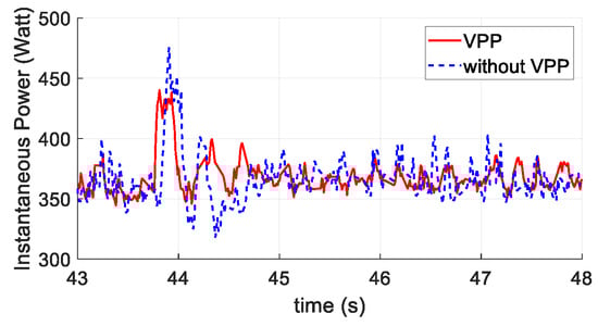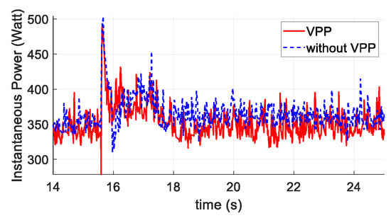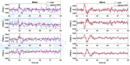 Figure 15 presents the output signals from the controller to each actuator. The format of the signals sending to the actuators are in the radio control pulse-width modulation (PWM) standard, which has a minimum and maximum value of 1000 and 2000 μs. As shown, the motor signals have less shift when applying the VPP controller. Since motors consume significantly more power than servos, this provides the evidence of less energy cost for the VPP controller. The instantaneous power during the test is shown in Figure 16, which indicates less power consumption when applying the VPP controller under a similar position tracking performance directly.