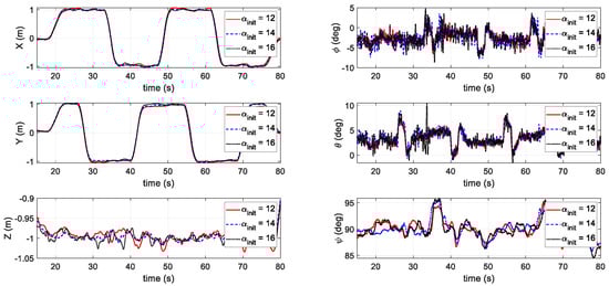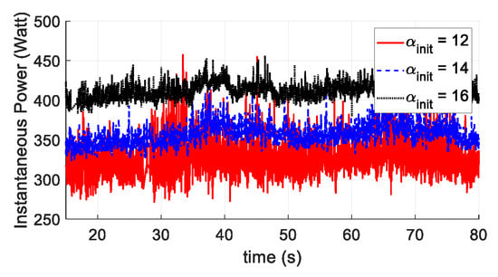 The last test scenario involved testing the power and energy consumptions at different initial pitch angles through waypoint mission tracking. The waypoint mission was to fly along with a squared waypoint with the side length of 2 m twice. The vehicle kept a constant speed of 1.5 m/s. The three were set at 12°, 14°, and 16°, respectively. From Figure 17, it can be seen that the tracking performance remained similar using different initial AOAs. The instantaneous power was lower for the UAV operated at the proposed ° (Figure 18). The total energy consumption at different is also compared in Table 4. Again, the initial setting at ° outperformed the other two AOA angles.