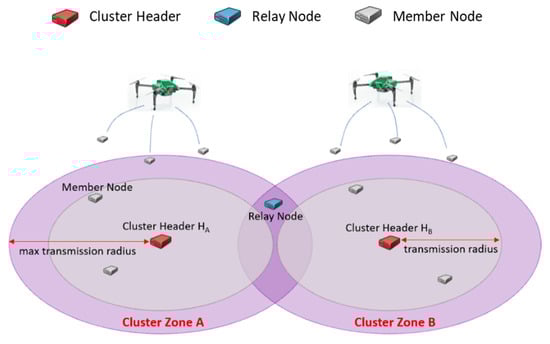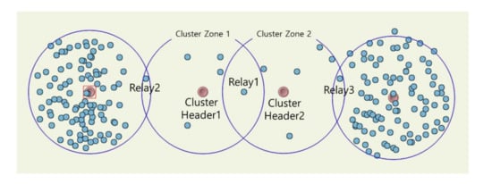 IoT hopping sensors are randomly distributed to a specific area to collect interesting data. For instance, sensors can be placed using UAVs and drones in areas where humans cannot access, as shown in Figure 1. The area could be divided into several appropriate cluster zones with well-known clustering algorithms. A proper sensor in each cluster zone’s center is elected as a cluster header, and the remaining sensors in the same zone as each header become member nodes. The header communicates periodically to manage information about its member nodes. This paper assumes that clustering and header selection methods are already available using various algorithms [], and it omits further discussion. Furthermore, the hopping sensor can jump to communicate with neighboring sensors, and the sensors can know their location using GPS []. The hopping sensor’s characteristics have been known in previous papers, so detailed explanations are also omitted.