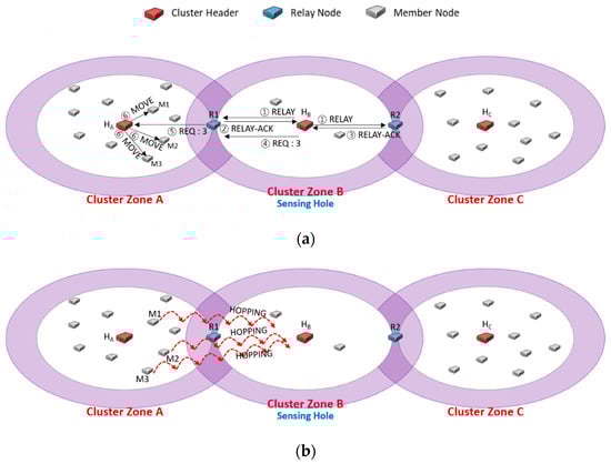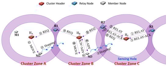 Figure 4 shows the case of continuously sending a message to request the needed members only to a specific relay node. We assume that there are three cluster zones, and cluster zone B is a sensing hole. A cluster zone is determined as a sensing hole if the number of member nodes is less than 5. Figure 4a shows that the header HB of the sensing hole broadcasts RELAY message to relay nodes R1 and R2 (①). Upon receiving the RELAY message, the relay nodes R1 and R2 reply RELAY-ACK messages to HB, respectively (②, ③). Suppose that HB first received the RELAY-ACK transmitted from R1. HB adds the information of the number of members (i.e., 3) to the REQ message and transmits it (④), and then R1 delivers the message to the header HA (⑤). Finally, HA sends MOVE messages to three appropriately selected nodes among all members (⑥).