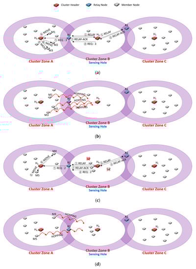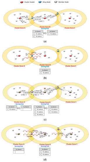 In Figure 6b, cluster zone A becomes a sensing hole as the members move. In Figure 6c, cluster zone B is also a sensing hole due to a member node’s failure. The header HA broadcasts a RELAY message (①), and another header HB also broadcasts another RELAY message in its zone (②). In cluster zone A, HA puts the address of R1 in its queue as receiving a RELAY-ACK message from R1 (③). In cluster zone B, HB also adds the addresses of R1 and R2 to its queue when it receives RELAY-ACK messages from R1 and R2 (④, ⑤), respectively. In order to select an appropriate relay node, each cluster header dequeues a candidate relay node with a higher priority in its queue. So, HA selects R1 and transmits a REQ message (⑥), and R1 delivers the message to HB (⑧). HB dequeues the R2 address and sends a REQ message to R2 (⑦). R2 forwards the message to HC (⑨). Therefore, as shown in Figure 6d, the ping-pong problem could be prevented in advance.