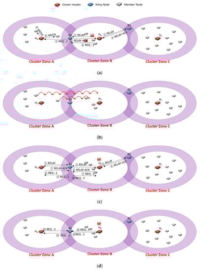 Undoubtedly, the method to solve the ping-pong problem as described in Figure 5d is to evenly choose a relay node, not the shortest distance-based selection. As shown in Figure 6, we proposed a queue-based scheme to select a relay node equally in this paper. Each header adds the relay nodes as candidates to its queue using RELAY-ACK messages in order. Each candidate node will be brought out in order of priority when a cluster header chooses a relay node.