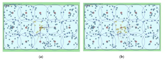 300 sensors are scattered randomly, as shown in Figure 8; If necessary, the sensors can be distributed in a particular way, but they are generally uniformly distributed in our simulation. Among them, 15 cluster headers are arranged (red color), and the remaining 285 things are sensor member nodes (i.e., 19 member nodes per cluster zone). We consider the scenario in which every sensor member node continuously collects requested data in the central cluster zone and rapidly consumes energy. We set a simulation parameter that each sensor in the middle cluster can generate a data collection event with exponential distribution (average of 5 min). A cluster header can detect an occurrence of a sensing hole (less than ten sensor member nodes) after broadcasting a HELLO message for every specific period (i.e., HELLO message interval time). We also color a sensor member node as yellow when it becomes faulty due to energy depletion after continuous data collection. We indicate the movement of a sensor member node by a solid line.