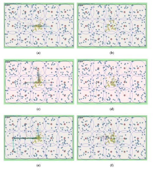 Simulation snapshots for each relocation protocols in terms of HELLO message interval time. (a) Previous scheme w. 60 min; (b) Proposed scheme w. 60 min; (c) Previous scheme w. 30 min; (d) Proposed scheme w. 30 min; (e) Previous scheme w. 15 min; (f) Proposed scheme w. 15 min.