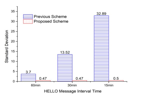 Figure 10 shows the standard deviation values for the frequency of selecting relay nodes to request the needed sensors from the cluster header, which is the middle of the area in Figure 9. Since the header selects a relay node that responds fastest in the previous algorithm, there is a very high possibility that specific relay nodes could be repeatedly selected. It is also improbable that the relay nodes located in the remote place are selected in response to late. In the proposed algorithm, the priority of the relay nodes to be selected is managed as a queue, so the standard deviation value for the frequency of selecting relay nodes is relatively low compared to the previous one. In other words, as can be seen in Figure 9, it is confirmed that the majority of relay nodes are selected in a similar proportion.