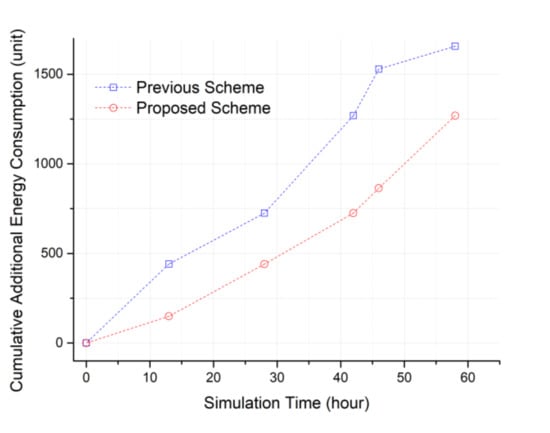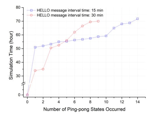 In the proposed scheme, there was almost no occurrence of a ping-pong phenomenon. However, as shown in Figure 11, the ping-pong phenomenon steadily occurred in the previous scheme due to using specific relay nodes as close as possible. When the HELLO message interval of the cluster header capable of detecting the sensing hole is set to 15 min, there is a cluster zone in which continuous data collection is actively performed. In this case, a continuous sensing hole may occur, which means that a ping-pong state is likely to occur. In Figure 11, it can be seen that many ping-pong problems occurred between 50 and 60 h of simulation.