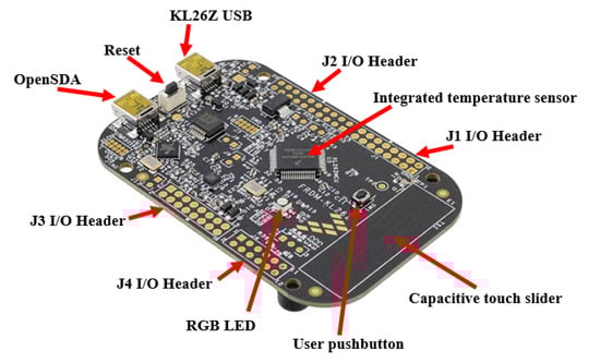 Figure 2 shows the location of the temperature sensor and other components of the FRDM-KL26 board. This system allows capturing thermal transients. Then, to control the peak temperature excursions, we have developed a new algorithm in embedded C for real-time thermal management and monitoring using the integrated sensor. Using the MCUXpresso software, we developed a program to activate one or more of the available red or green LEDs depending on the temperature predicted for the Freescale FRDM-KL26Z board.