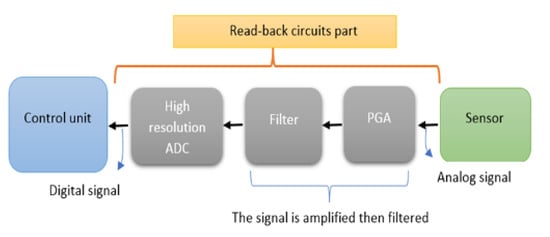 The analog signal provided by the sensor is applied to a programmable gain amplifier, filtered and then digitized by means of a high-resolution analog-to-digital converter (ADC). Then, the generated digital signal is applied to a control unit.