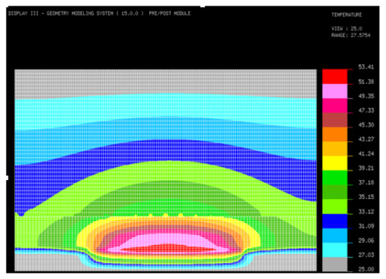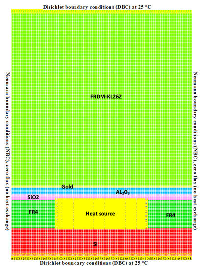 The physical behavior of the map is described by means of partial differential Equation (1) and boundary conditions. The finite element method transforms the partial derivative equations into algebraic equations. This method allows temperature analysis to be performed at different points. However, the vertical boundary condition still causes a big problem for numerical simulations. The simplest approach is to set a constant temperature below the structure at 25 C representing the ambient temperature, and this produces a thermal short circuit. In order to solve thermal equations, the boundary conditions must be defined. Figure 5 shows the first simulation result of the heat sources on the FRD-KL26Z board.