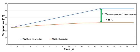 Figure 6 shows a transient thermal simulation of the FRDM-KL26Z map caused by natural convection as modeled by the NISA tool, which gives a good idea of the thermal evolution of the map. Moreover, we can see that the temperature decreased to 32 C with a difference of 21 C. The characterization of the thermal dynamics of the FRDM-KL26Z board is based on two numerical techniques: CFD (Computational Fluid Dynamics) and the other HTA (Heat Transfer Analysis). The CFD technique, which already takes into account the strength of the heat flow mechanism on the electronic board, and the physical properties will be linked with the temporal and spatial aspects of the HTA to deal with boundary conditions and temperature distribution in the dynamic regime. Thus, the temperature distribution on the surface of the map will be used for the prediction of the thermomechanical stress localized at the sensor location. To visualize the difference between the two types of analyses, a graph (Figure 7) is used to clearly show the actual difference between the two types of analyses using natural convection and non-convection in succession.