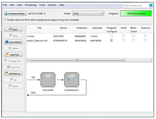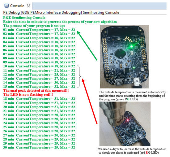 The outdoor temperature has a great impact on the measurement results, as we are dealing with a very sensitive sensor integrated in the FRDM-KL26Z board, which is able to detect temperature peaks in real time thanks to an integrated C code (Figure 11). By using the NISA simulator to extract different thermal peaks from the FRDM-KL26Z card in transient (Figure 9), the algorithm works inside the system and operates autonomously. This algorithm has been developed and integrated using the MCU microcontroller (MCU) based on an Arm® Cortex®-M0+ core using real-time embedded C. This algorithm is able to generate and detect the current temperature and the maximum temperature value at 32 C (Figure 11), and we can do real-time thermal management around the board. However, we wanted a marking program that did not get stuck when there were potential measurement errors (0.1 C according to the datasheet of the FRDM-KL26Z board) or user input errors. To do this, we simply decided to warn the user that there could be potential measurement errors that did not exceed 0.1 C, knowing that the map displays two options “1” or “2” in the console. Either the user or the code will be able to choose the right option to initialize the operation of the system. To verify and validate the efficiency of our aglorithm, we implemented the FPGA board for rapid prototyping.