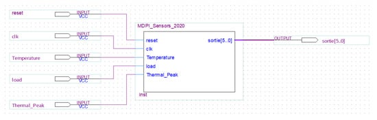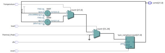 This part presents the description of the architecture of the thermal peak control unit using a VHDL code editor, with the system generator of the Quartus Prime Navigator, which can synthesize the design and generate the RTL files as shown in both Figure 12 and Figure 13.
