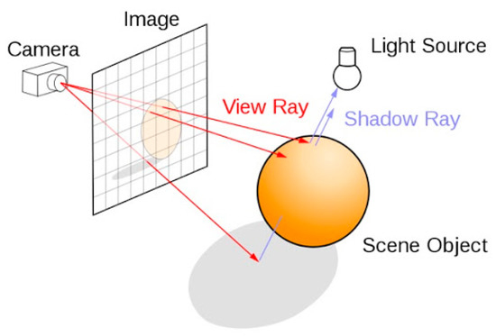 - Ray Trace diagram.svg. Available online: https://en.wikipedia.org/wiki/Ray_tracing_(graphics)#/media/File:Ray_trace_diagram.svg (accessed on 17 September 2020).
