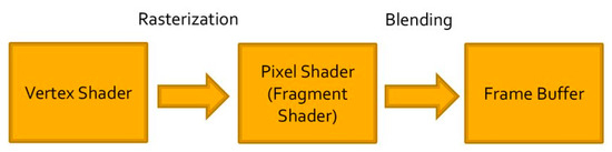 The virtual world generated in VR devices is programmable and can be created in the image and likeness of the real world or not, as needed. Currently, there are two main software platforms for developing virtual reality content: Unreal Engine [18] and Unity Game Engine [19]. In both platforms, mathematical functions are used as basic rules of internal functioning that seek to reflect, to a greater or lesser extent, the real world through physical laws [20]. The geometry of the scene is supplied to the graphics card, and this hardware then projects the geometry and breaks it down into vertices (Figure 2). Then, the vertices are transformed and split into pixels, which obtain a final rendering treatment before they are passed to the screen through the Frame Buffer.