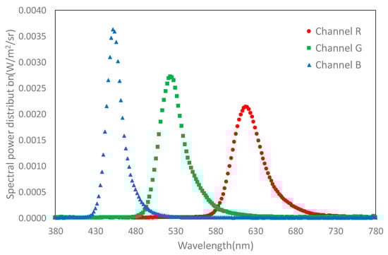 Spectral power distribution of the RGB channels measured at the maximum digital-to-analog converter (DAC) value.