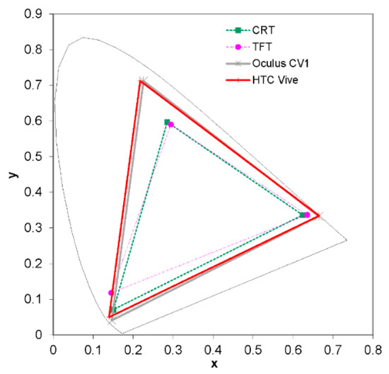 The color gamut is a subset of colors that can be accurately represented in a given color space or by a certain output device like a display. In this work, we measured the color gamut of our HTC Vive device by comparing its color gamut with that of other devices, such as an Oculus Rift CV1 and classic CRT and TFT monitors (Figure 4).