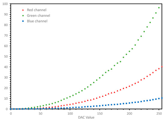 We analyzed the relationship between the values of the digital-to-analog converter (DAC) of each RGB channel and their corresponding values of luminance Y (Figure 5). The measurements were made using our tele-spectroradiometer for each of the R, G, and B chromatic channels independently, with a range of DAC values from 0 to 255 and a step of five units.
