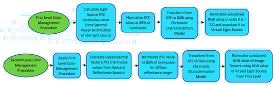Figure 6 shows a flux diagram for both levels of the color management procedure developed. The first level is only applied to the virtual light sources defined inside the virtual scene. The second level requires one to apply the first one and calculate the image texture of each 3D object starting from its hyperspectral image. The entire C# script for both procedures is attached as Supplementary Material for this paper.