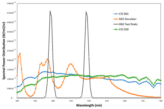 To study the effects of these two levels of implemented color management, we used four different virtual light sources: a D65 illuminant, a D65 simulator obtained from a commercial lightbooth in our laboratory featuring 6-peak LED technology, and a theoretical LED source composed only of two spectral peaks chosen in such a way that the color of this source over a diffuse reflectance target coincides exactly with the color of the D65 illuminant. Figure 7 shows the spectral power distribution of all light sources employed in this work.