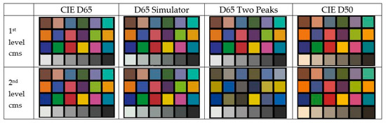 To assess the efficiency of the implemented color management system, a scene was designed in our 3D graphics engine, where only the virtual ColorChecker is illuminated by a single directional light source. The RGB values shown in Table 2 for different virtual light sources were assigned to this directional source to simulate this aspect of the ColorChecker under different light sources. In this way, the effectiveness of the first level of color management implemented (first row of Figure 8) was tested. Subsequently, the second level of color management was enabled, in which the chromatic textures of the 3D objects were recalculated according to the light source used, in addition to the actions performed at the first level (second row of Figure 8).