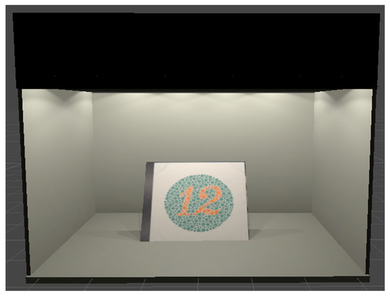 In this way, the final simulation scene was created and prepared to introduce the hyperspectral textures of the Ishihara plates. Figure 9 shows the final virtual scenario with the test plate of the Ishihara test. In this test plate, all observers must recognize the number 12.