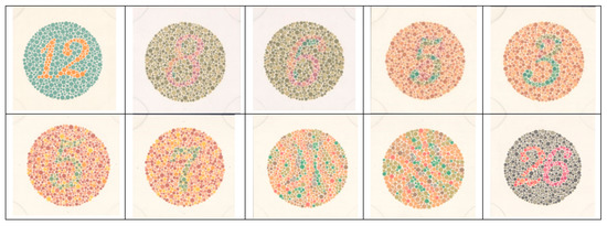 Set of 10 Ishihara plates selected to develop a quick virtual version test for colorblindness detection.