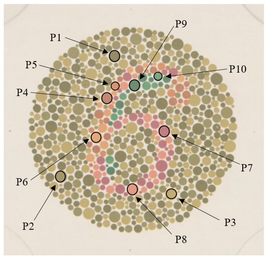 Table 5 shows the calculated chromaticity of 10 different color dots of plate number 3 starting from the hyperspectral image of this plate using CIE D65 as a light source. These 10 dots belong to 10 different colors labelled from P1 to P10, as shown in Figure 11. In the same way, the measured chromaticity of the virtual reality scene for these 10 color dots is shown on the right side of Table 5. The average color difference between the calculated and measured chromaticity of these 10 samples was below 1.0 units using the CIEDE2000 color difference formula. By checking each individual difference, it can be seen that the main difference is due to luminance rather than chromaticity.
